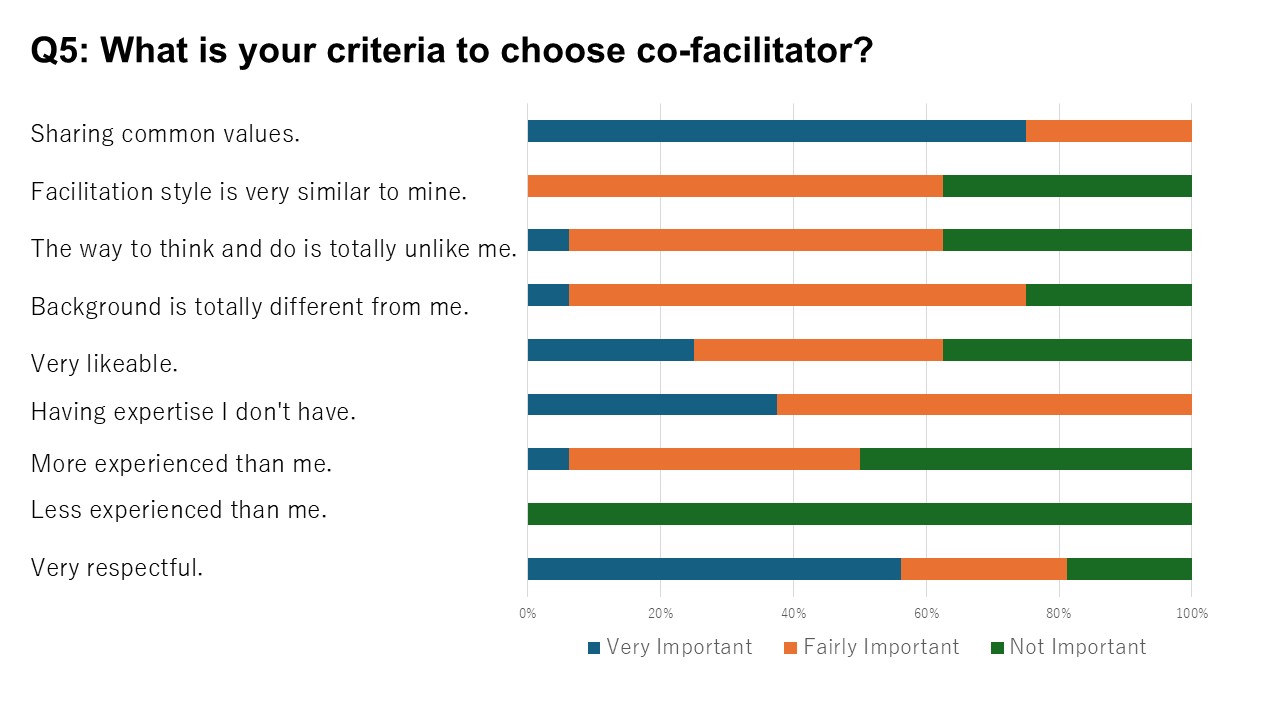 Of course, there is no single correct answer regarding co-facilitation, and there could be various perspectives. For example, the criteria for selecting a co-facilitator also varies as below.