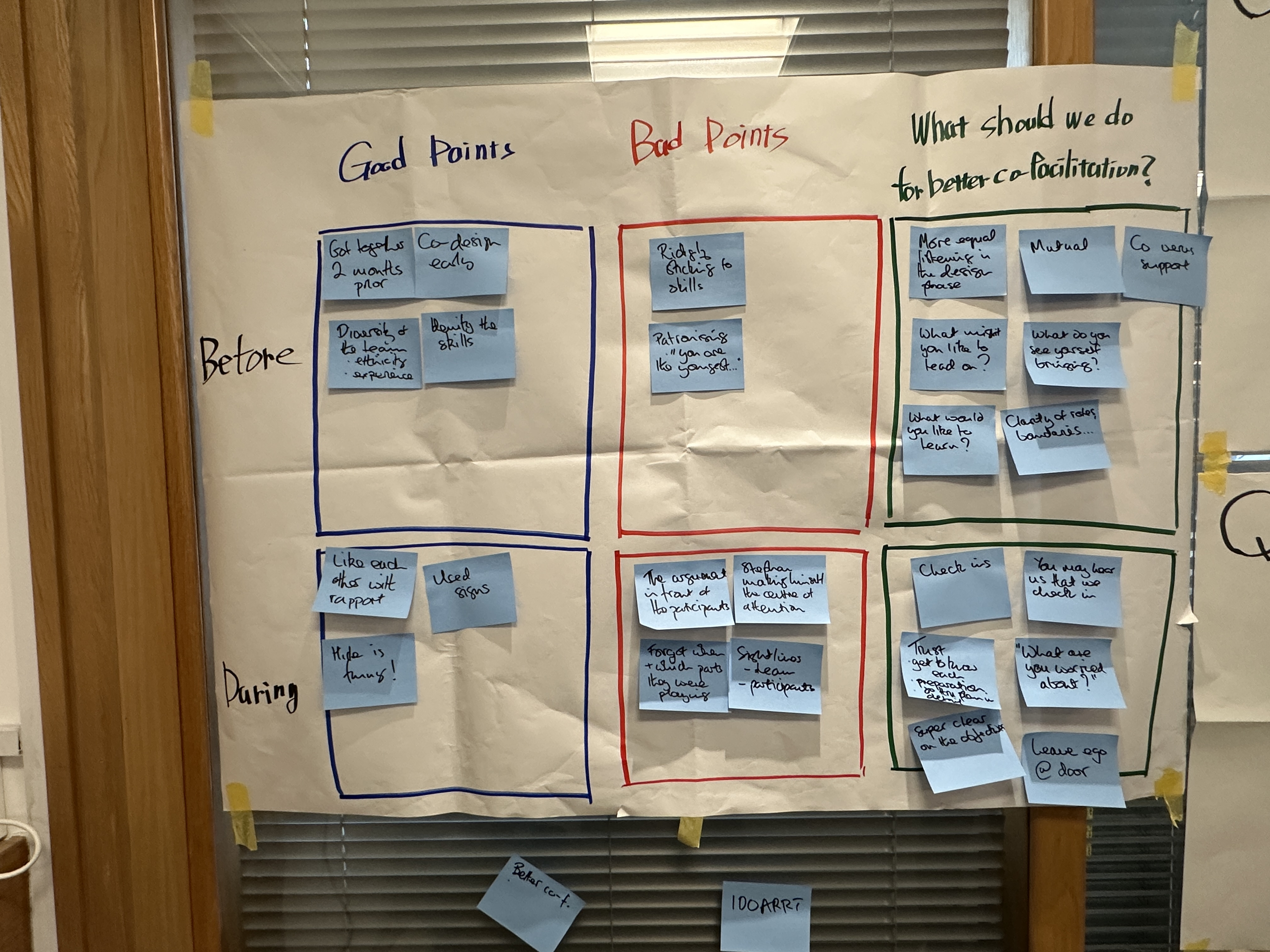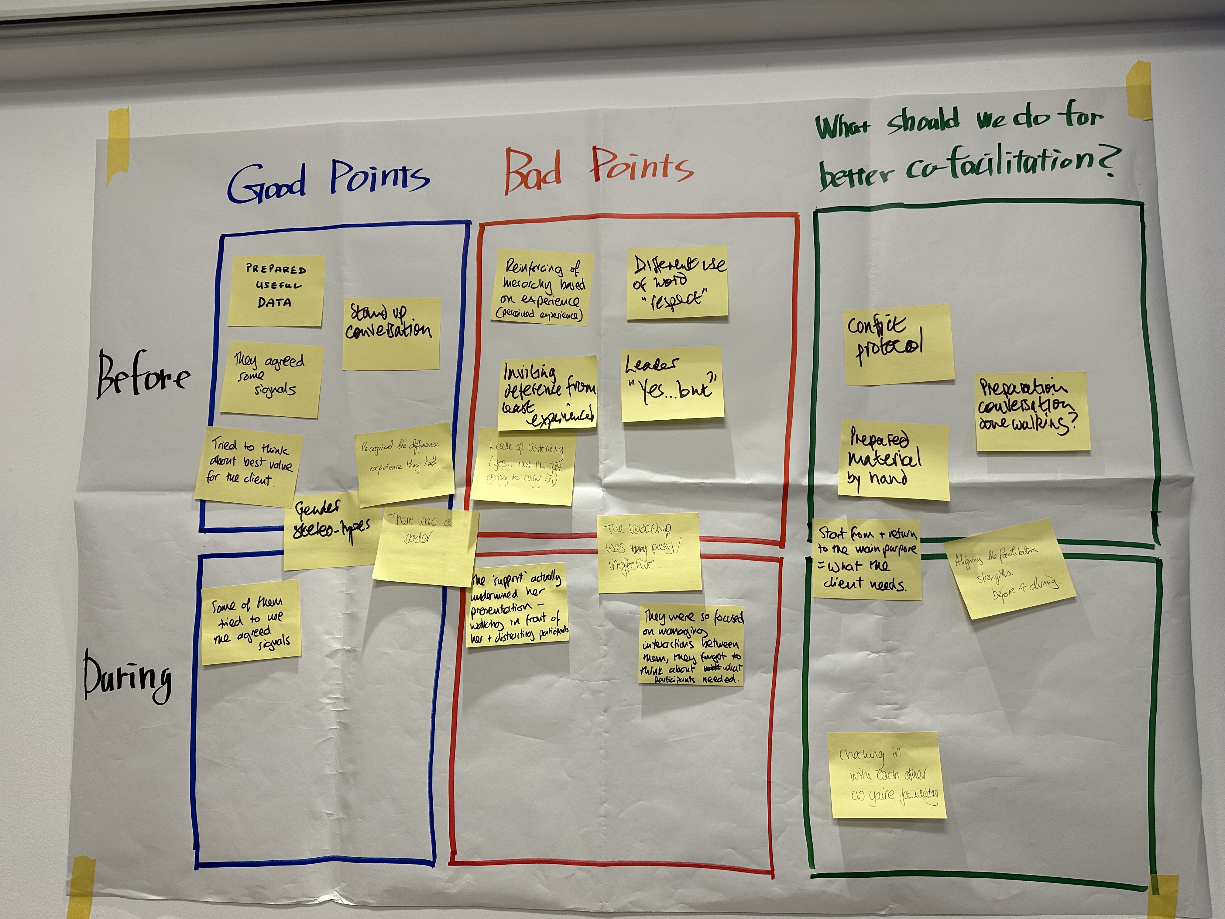 Participants were asked to list good and bad points observed before and during the session, and to consider what facilitators should do before, during, and after the session for better co-facilitation for both facilitators and participants.