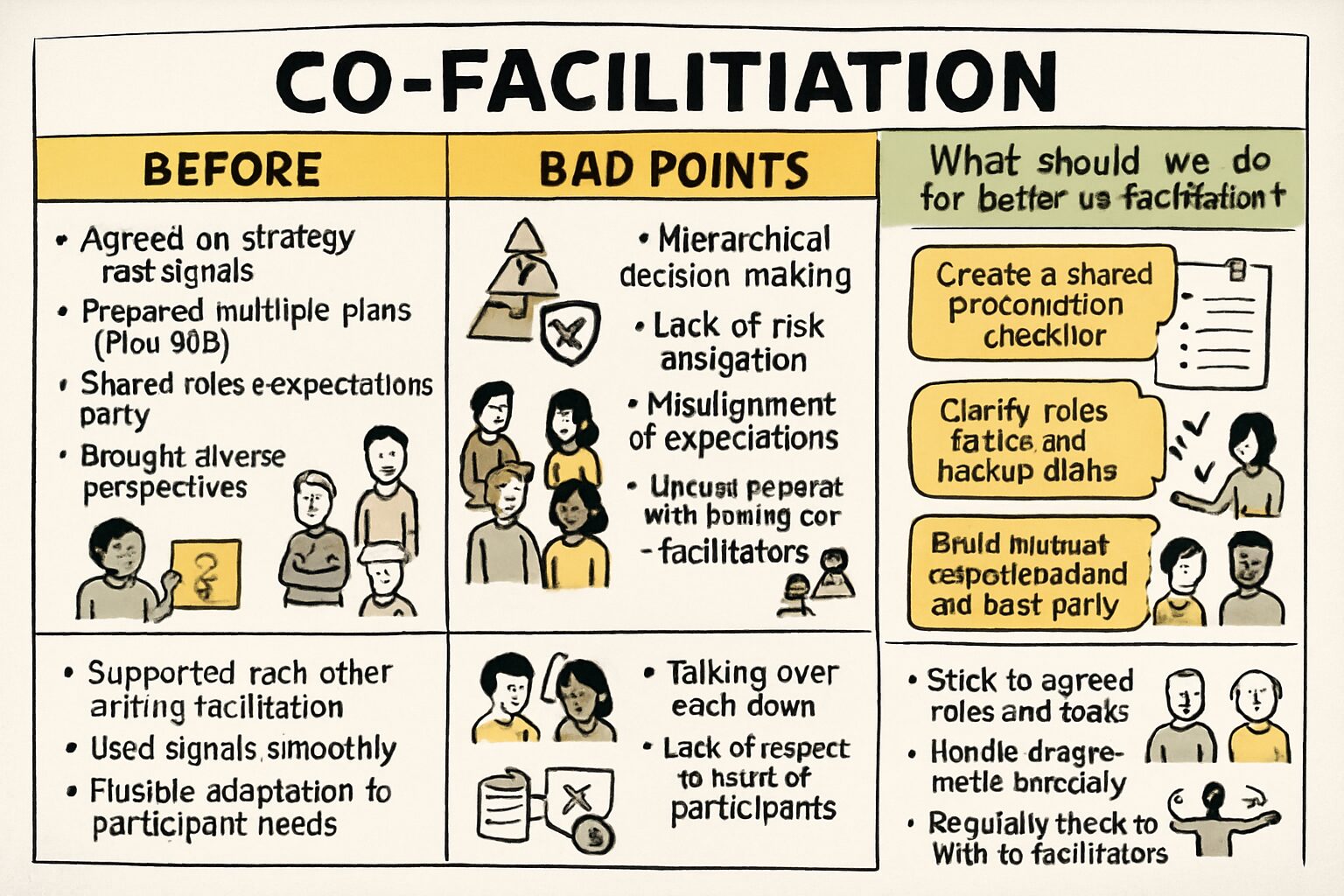 In this workshop, we not only showed bad examples of co-facilitation but also demonstrated good examples, asking participants to identify them and output what is necessary for good co-facilitation.